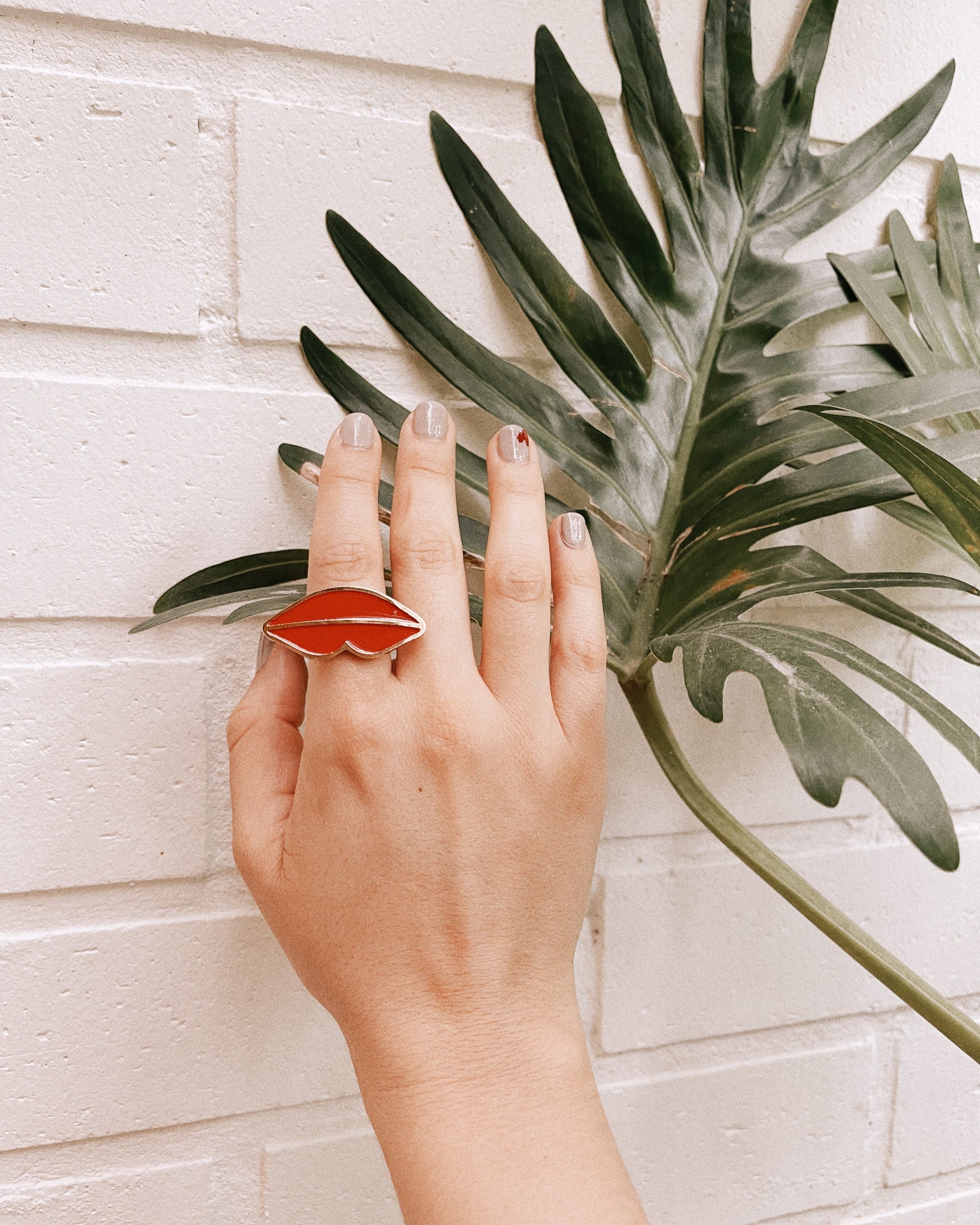 Fabricado en bronce con baño de oro de 24k, este anillo combina lujo y modernidad en un diseño icónico inspirado en la sensualidad de los labios.