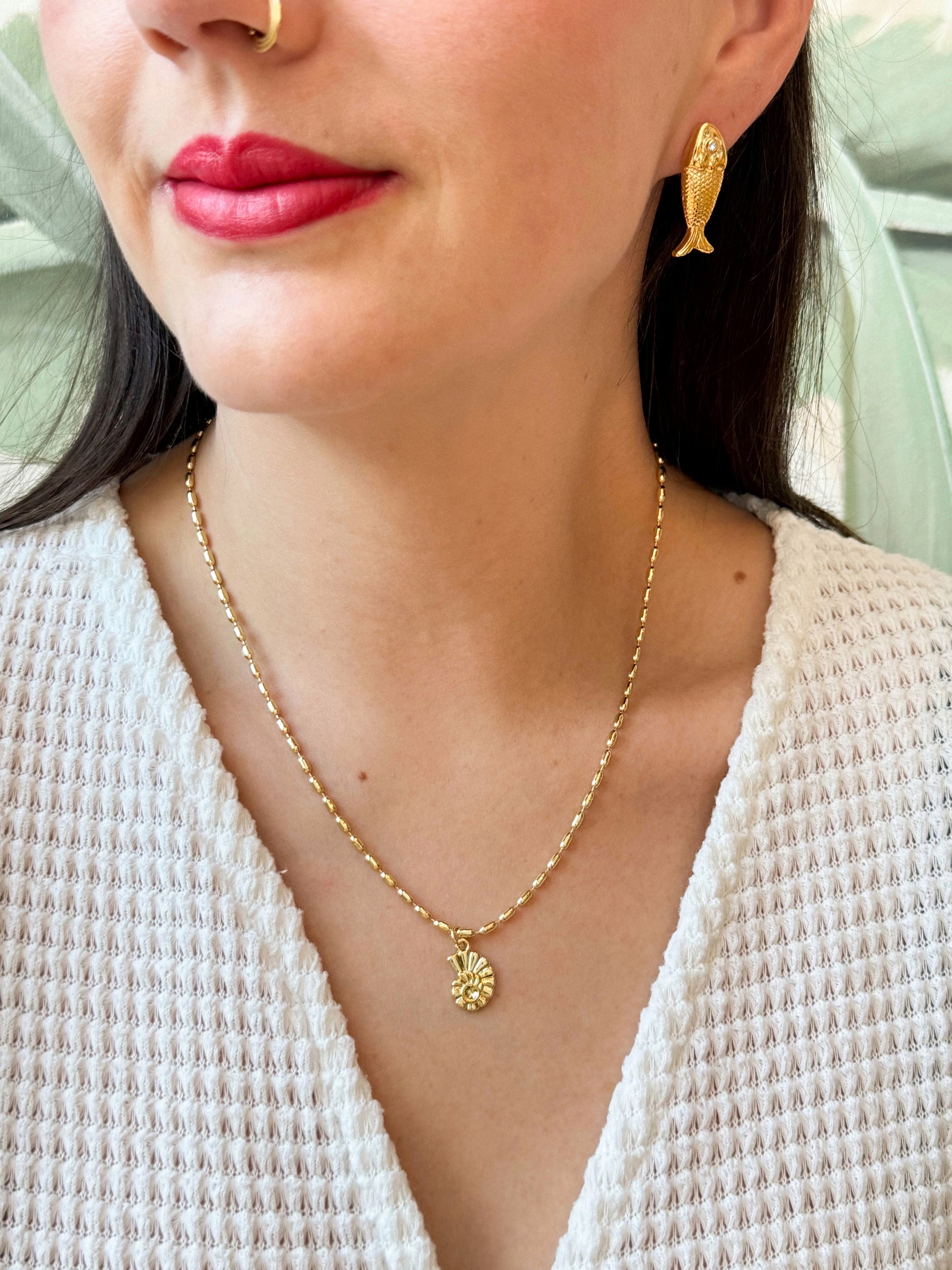 Un accesorio delicado y elegante que resalta la belleza en los pequeños detalles. La cadena fina y minimalista sostiene un dije de caracol, símbolo de calma, conexión con la naturaleza y la energía del mar.
