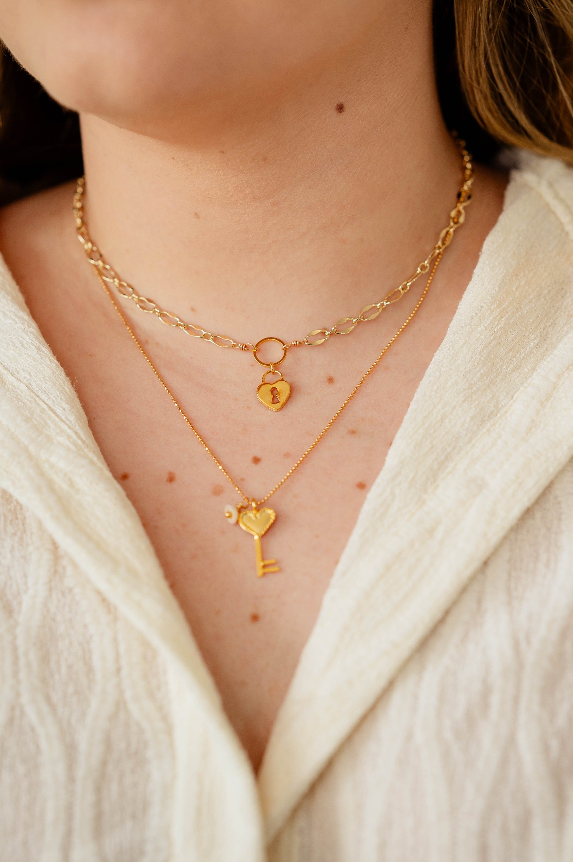 Su diseño incluye un dije de candado y una llave con forma de corazón, creando un significado romántico y atemporal.