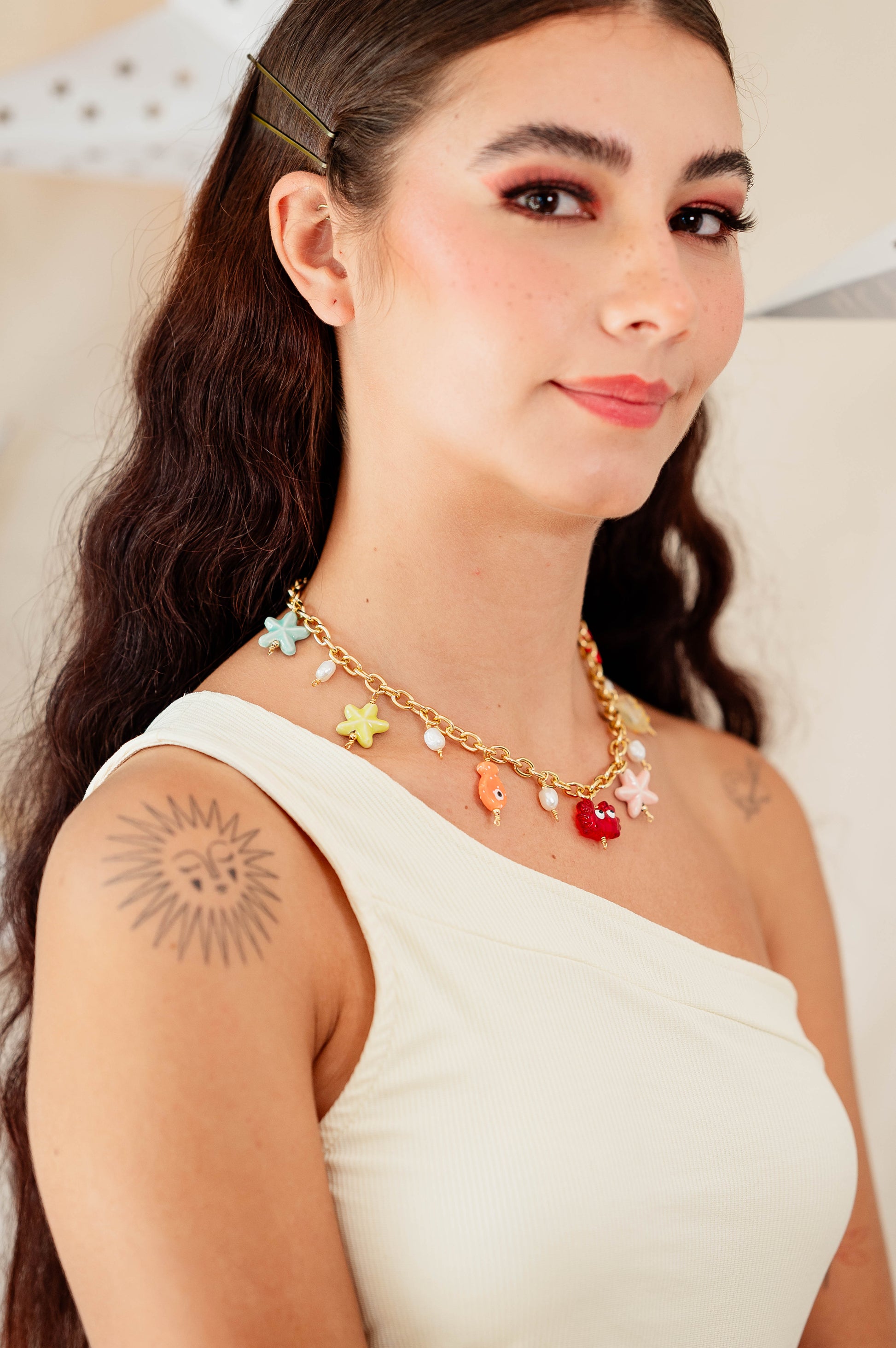 Cada dije está cuidadosamente seleccionado para crear una composición equilibrada y encantadora, inspirada en los tesoros del océano: estrellas de mar, peces, perlas y texturas marinas que evocan libertad, verano y autenticidad.