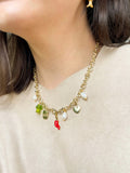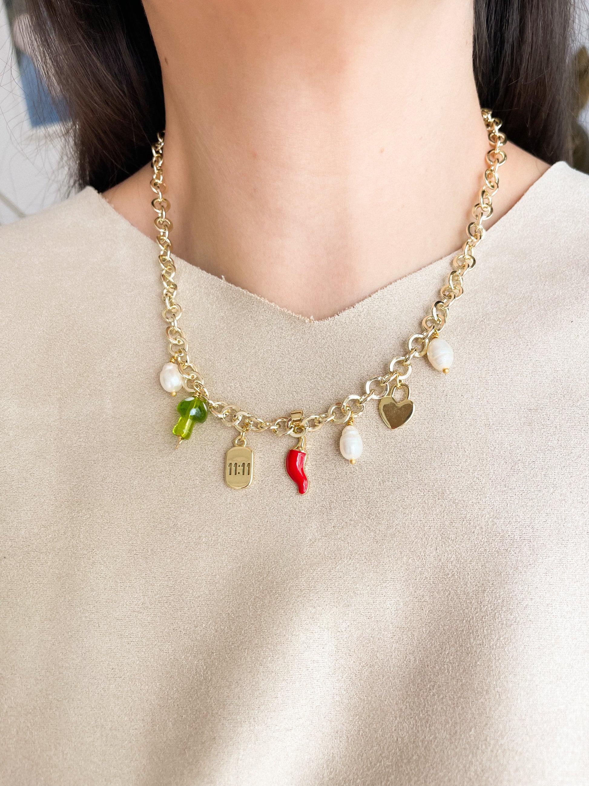Un accesorio lleno de estilo y personalidad. Su diseño combina aros delicados con una encantadora variedad de dijes el místico 11.11, un cerrazón ,un hongo ,un ají y detalles en perlas, creando una pieza única que refleja creatividad y originalidad.