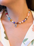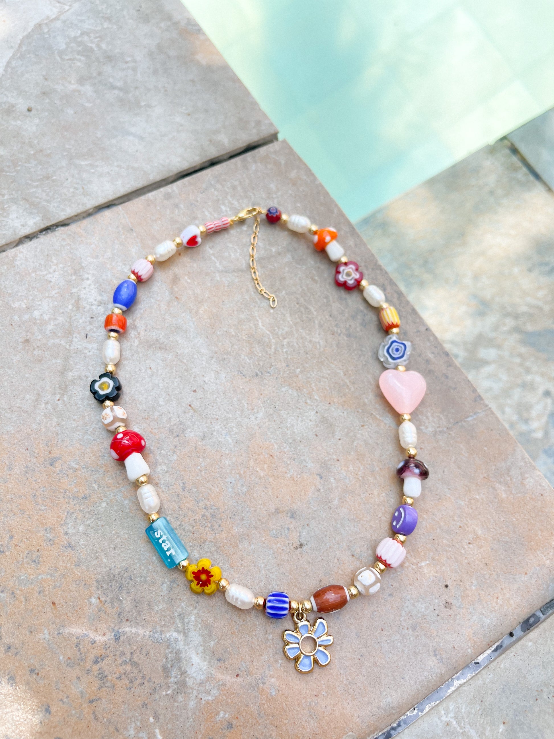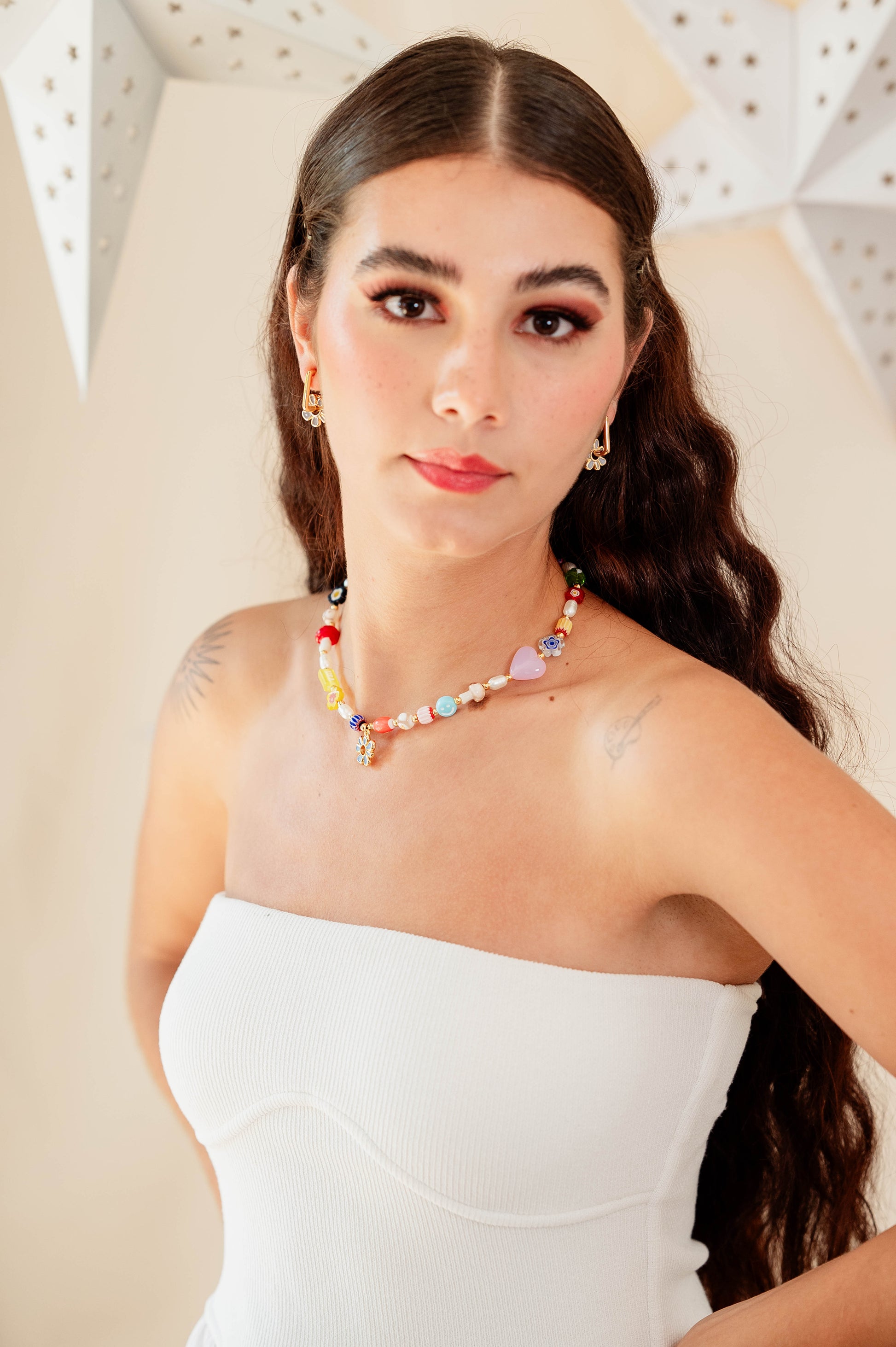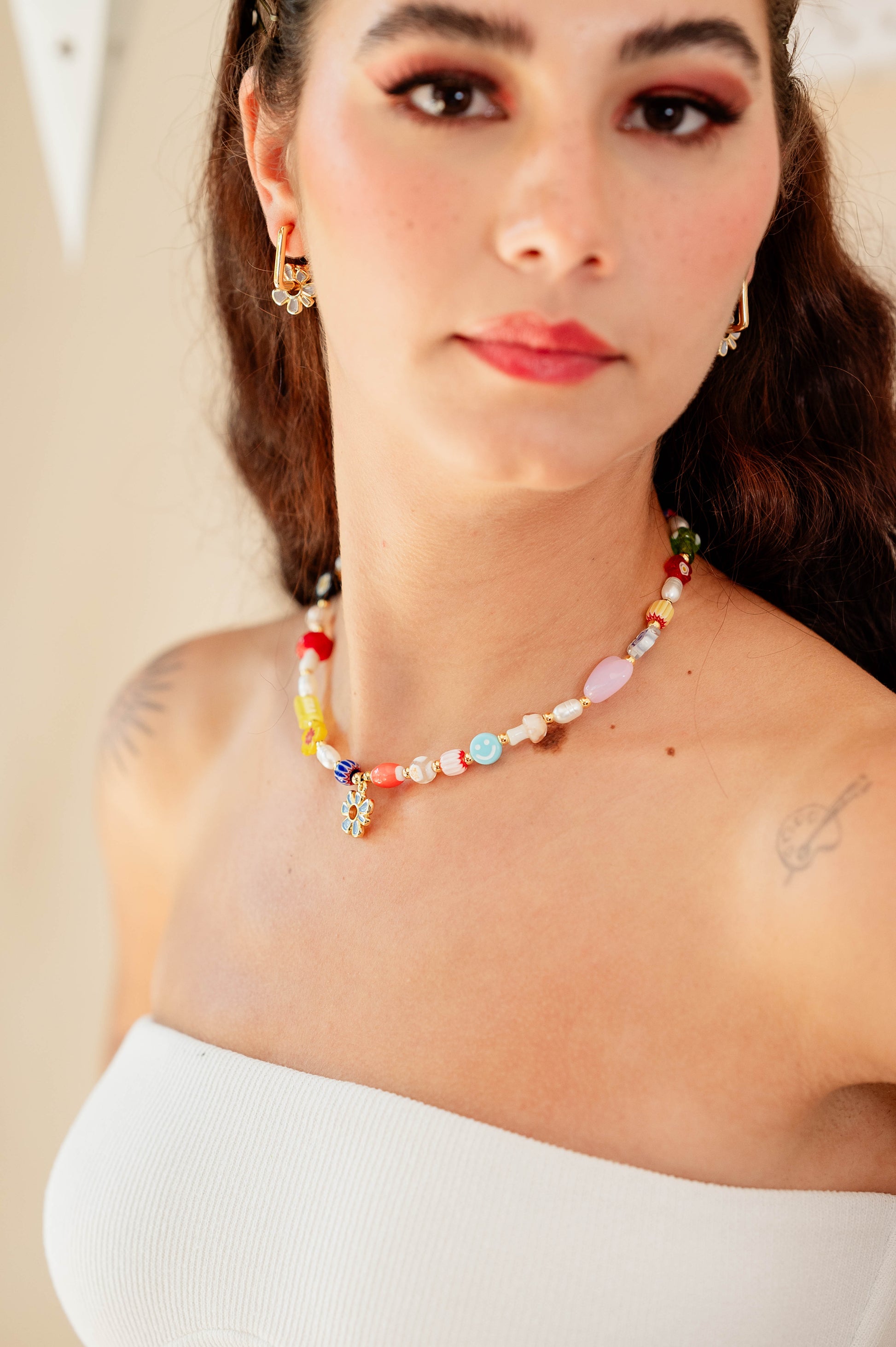Un accesorio alegre y fresco que combina variedad de colores y materiales, dando un diseño único y vibrante. El toque especial lo aporta su dije de margarita, símbolo de pureza, optimismo y belleza natural.