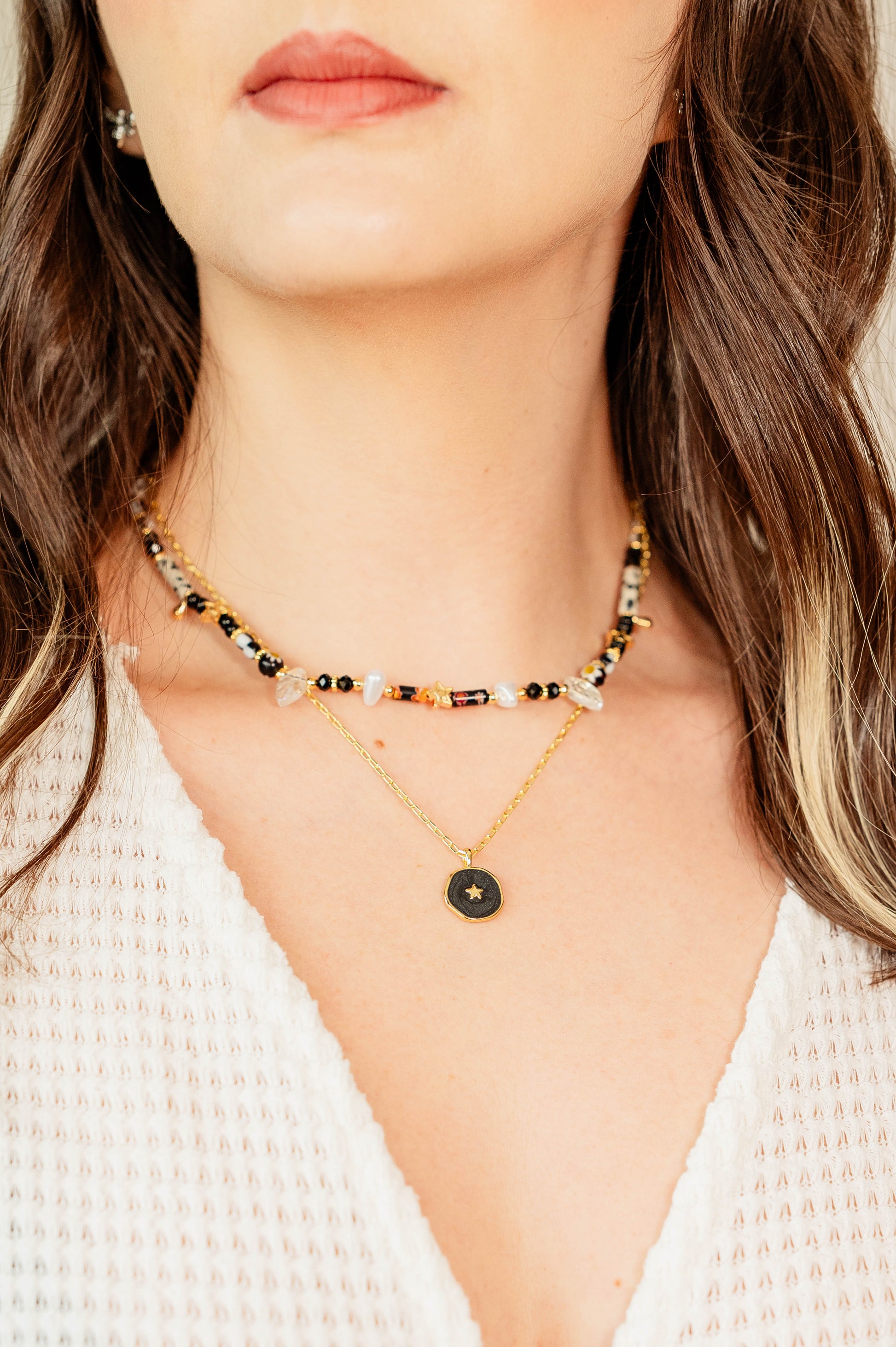 Este set combina la cadena de mini eslabon con un dije estrella negro y un collar de pidras naturales, creando un balance perfecto de sofisticacion para lucir cualquir atuendo diario,sencillo o elegante