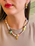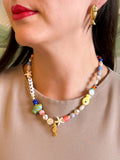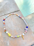 Un diseño divertido y fresco que refleja la esencia del verano. Este collar combina cuentas de colores vibrantes y con pequeños dijes de peces y la palabra "playa", evocando alegría, libertad y el espíritu marino.