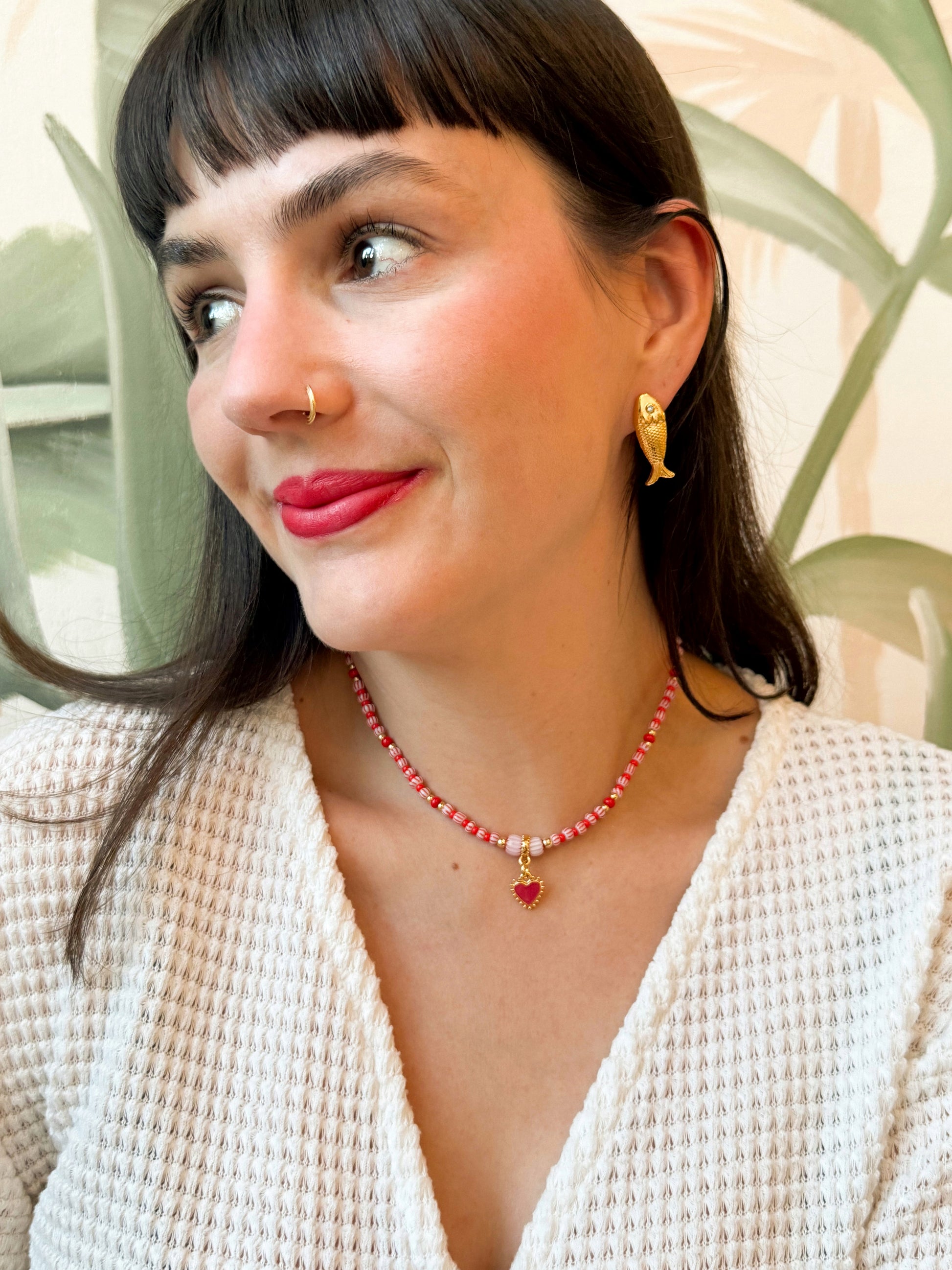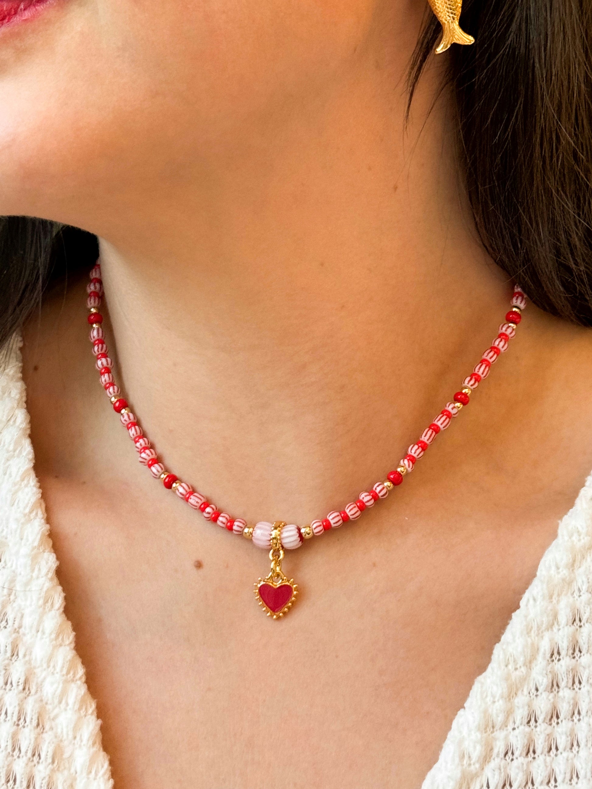 Un accesorio romántico y llamativo que destaca por su tono rojo y su elegante dije de cerrazón a juego. Una pieza que simboliza amor, pasión y estilo , perfecto para darle un toque especial a cualquier look .