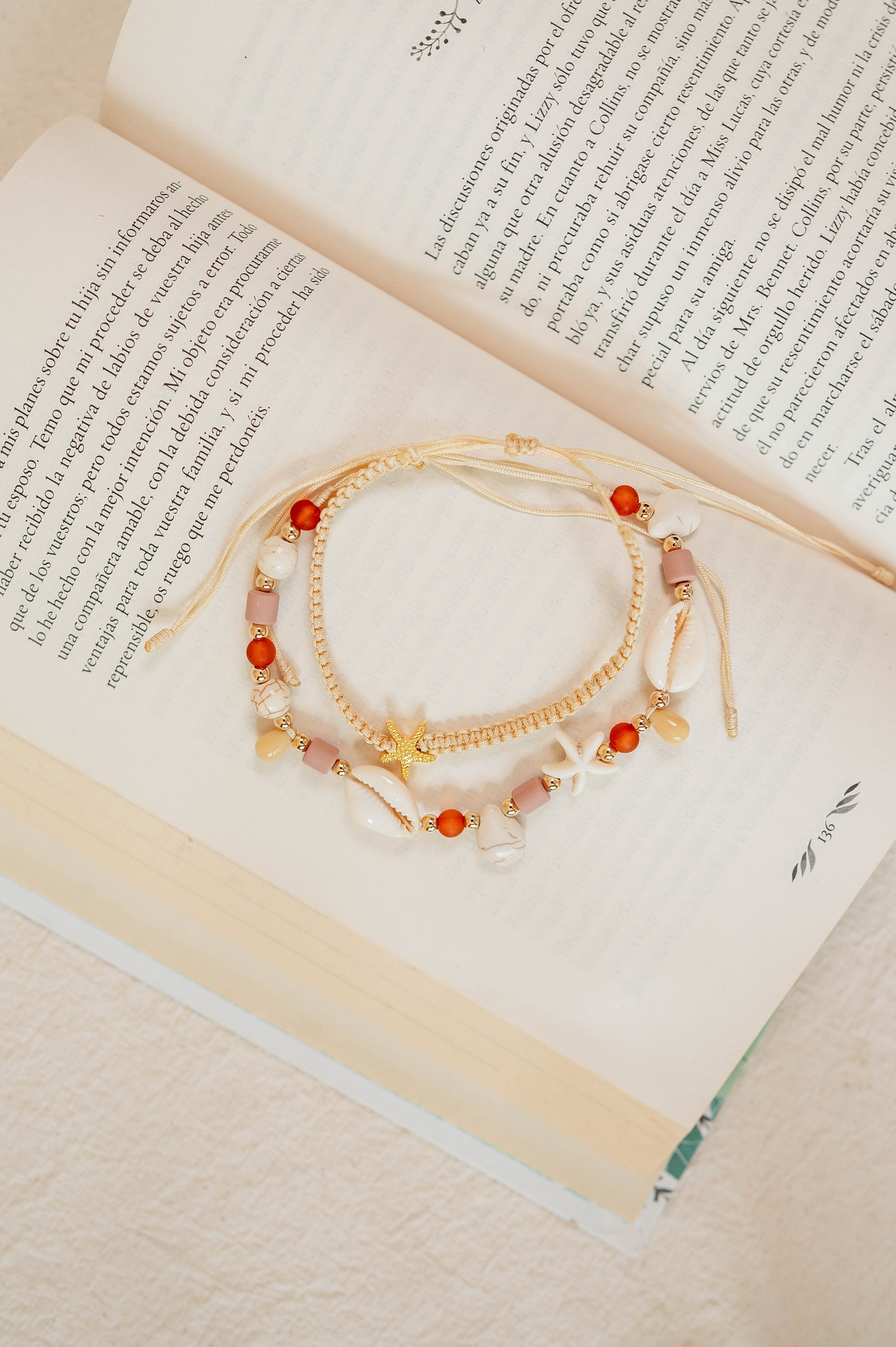 Un accesorio fresco y bohemio que combina cuentas en tonos cálidos con detalles marinos. Ideal para looks playeros y veraniegos.